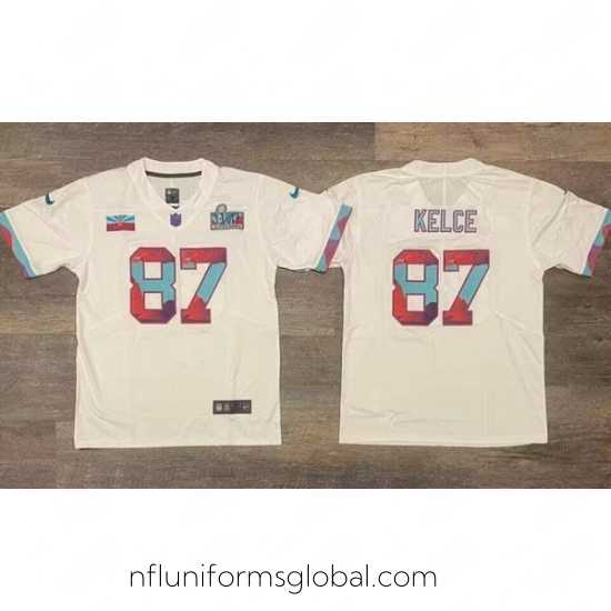 Divine Men’s Kansas City Chiefs #87 Travis Kelce White Super Bowl LVII Patch Vapor Untouchable Limited Stitched Jersey